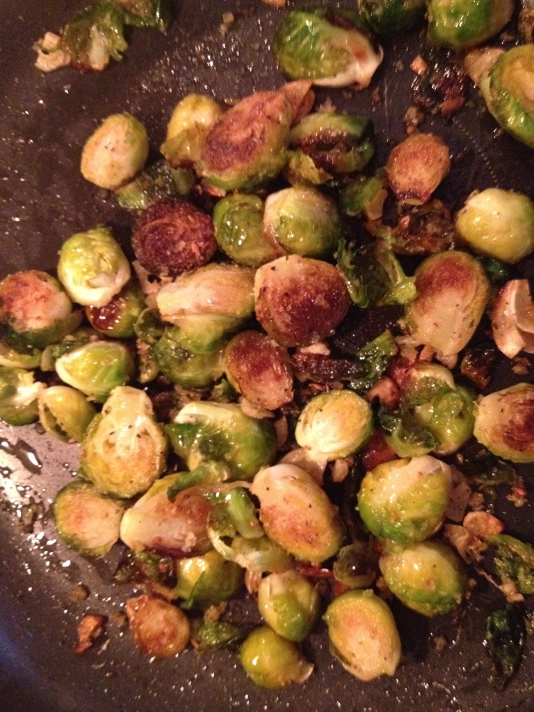 With this, we had panko encrusted, baked boneless pork chops accompanied by carmelized brussel sprouts with garlic, and potato gnocchi with shittake mushrooms, garlic and a touch of truffle butter.  People are always asking me for good side dishes to accompany their meals, so here are two simple preparations that are absolutely delicious.