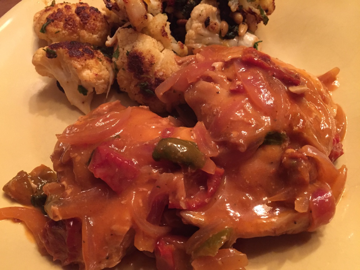 Return the chicken to the pot. Add the sundried tomatoes and the cherry peppers. Cover and simmer 15 minutes on low heat to finish cooking the chicken. When done, transfer the chicken to a serving bowl (see picture above) and add the corn starch/water to the sauce in the pot. Bring to a boil and stir through. The sauce will thicken nicely. Pour all the sauce over the chicken and serve!
