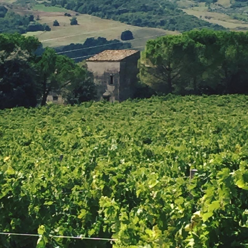 | ~ The Torre Migliori Vineyard at Cerulli Spinozzi in Abruzzo. The “tower” at center marks the vineyard and Migliori is the name of winemaker Enrico Cerulli’s Mother. |