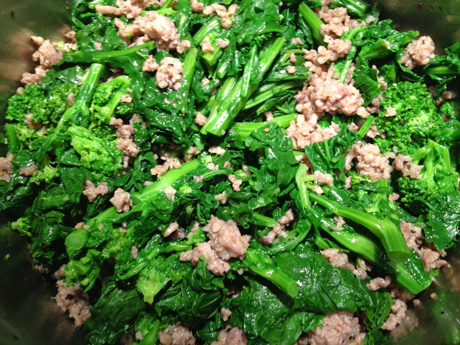 Begin by browning the sausage in a saute pan large enough to ultimately hold all the ingredients. Cook the sausage through. Add some extra virgin olive oil along with the garlic and onions and saute scraping the bottom of the pan as you go. Season with salt and pepper.