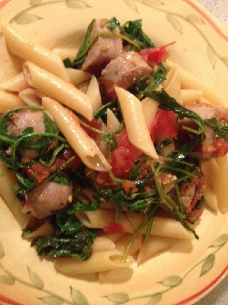 Boil the water and begin cooking the pasta.  About 5 minutes before the pasta is done, take 2 large handfuls of the arugula and add it to the tomatoes. Take a third handful and put it into the bottom of a large serving bowl.  Once the pasta is cooked, drain and combine all the ingredients into the serving bowl.  If the pasta sauce looks tight,  add some extra olive oil or reserve some of the pasta water and add that.