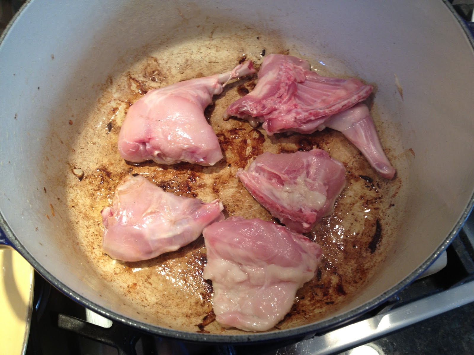 Start by patting dry the rabbit pieces and browning the meat. Work in batches and don’t crowd the pan. Take time to get some nice color on the meat. Season with salt and pepper as you brown the pieces.