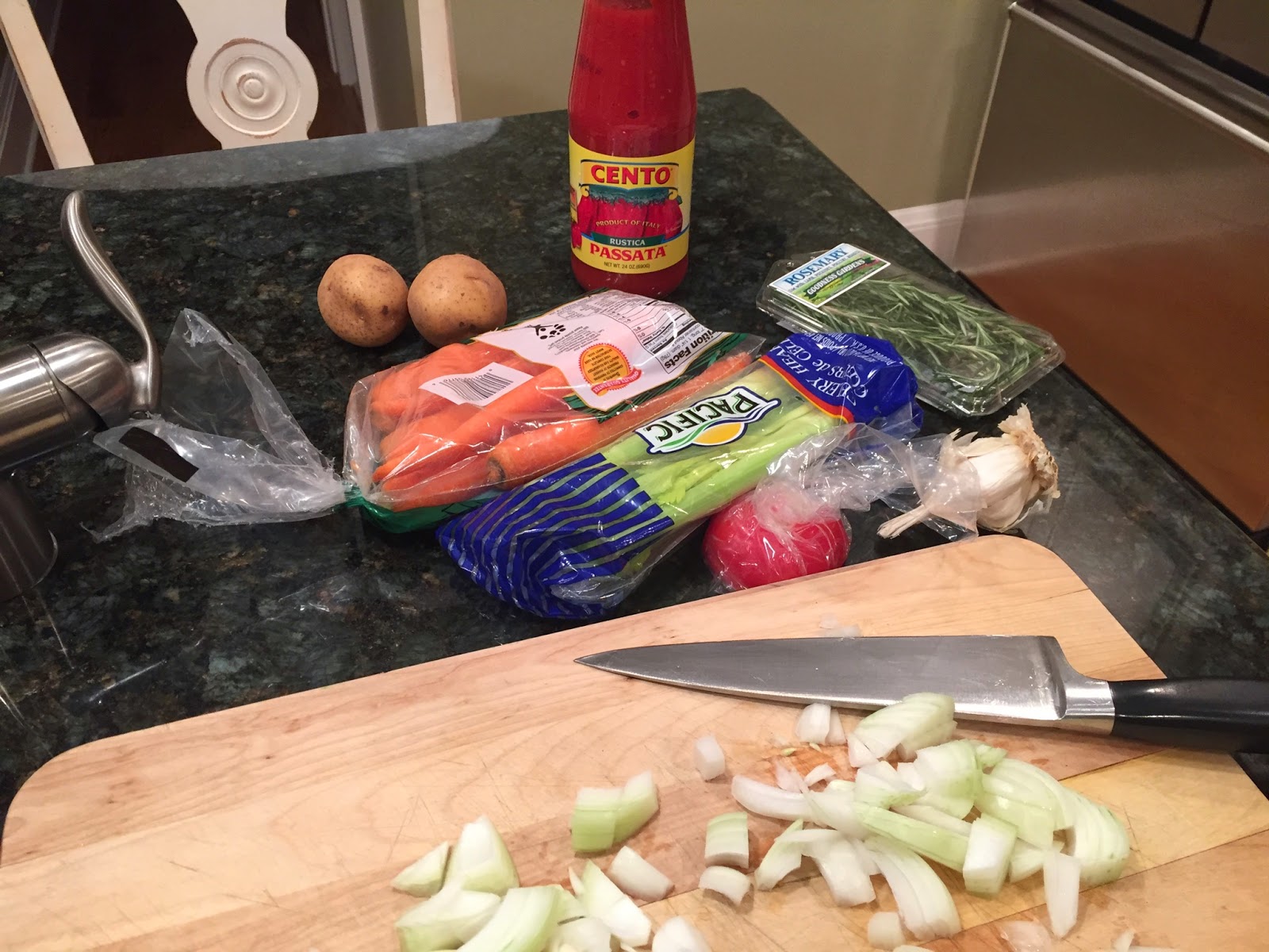 Once the meat is finished browning, deglaze the pot with 1/2 the red wine and scrape all the browned bits from the bottom of the pan with a wooden spoon. Add the carrots, celery, potatoes, rosemary twig and 1/2 the jar of the Passata. Reduce the heat to medium-low, cover and simmer for 45-60 minutes. Check and stir occasionally just to make sure the stew isn’t drying out.