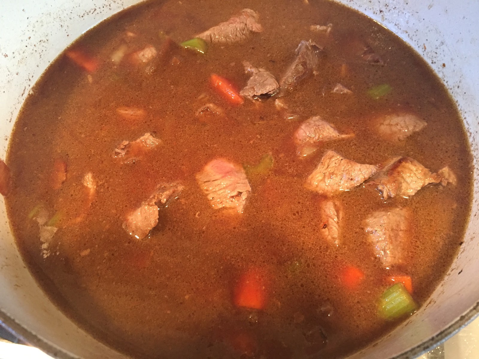 Cover and lower the flame so that you’ve got a slow simmer. At this point, you’re essentially done except for two final steps. After the stew has been cooking for about 3 hours, add the porcini mushrooms and their broth and then add the potatoes. Stir in well to combine.