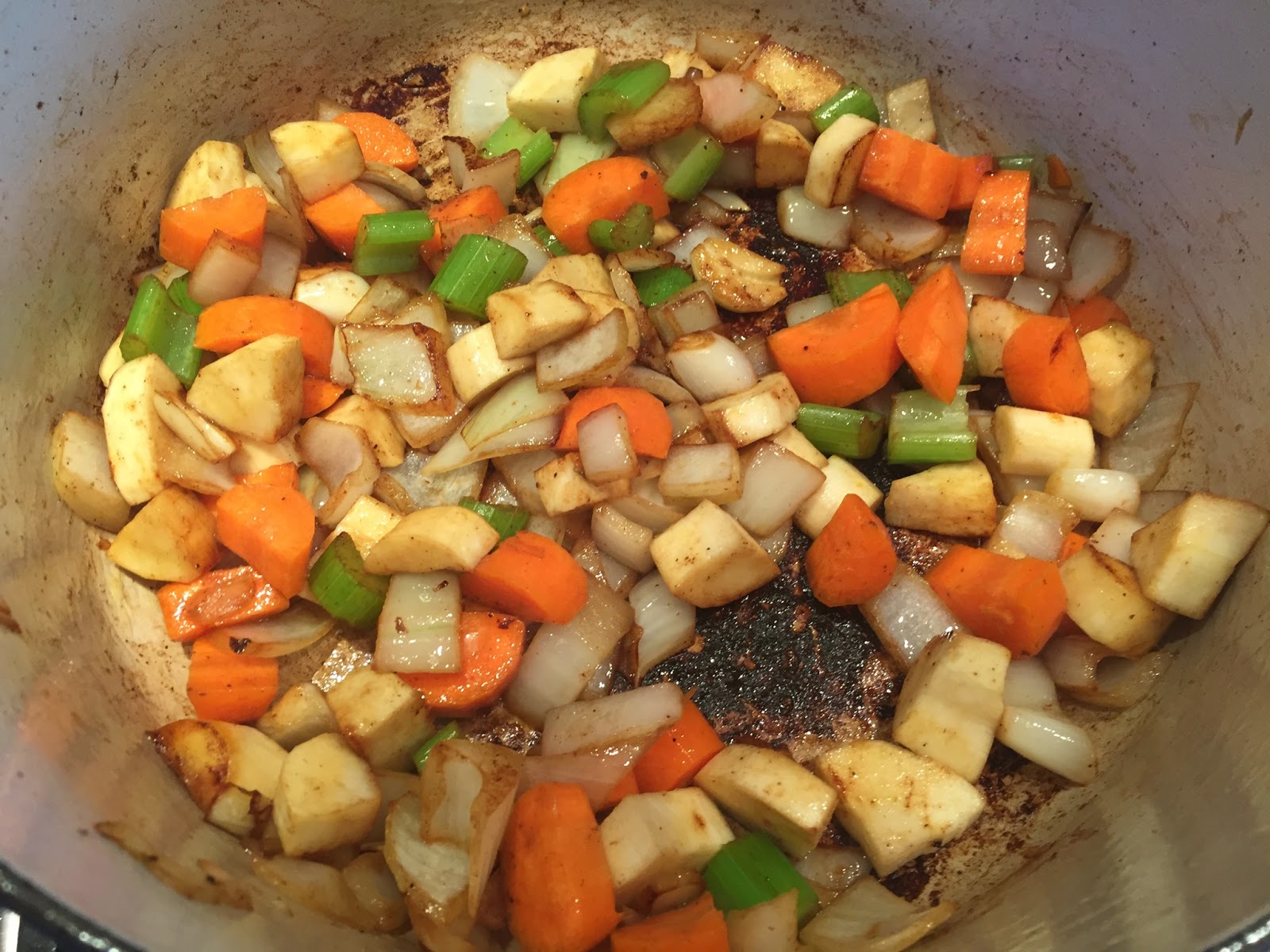 Note the color on the meat above. That’s what you’re looking for. This was the first of three batches that I browned. Don’t overcrowd the pot. Remove the meat to a plate as you go. Then, add the chopped vegetables and saute until softened.