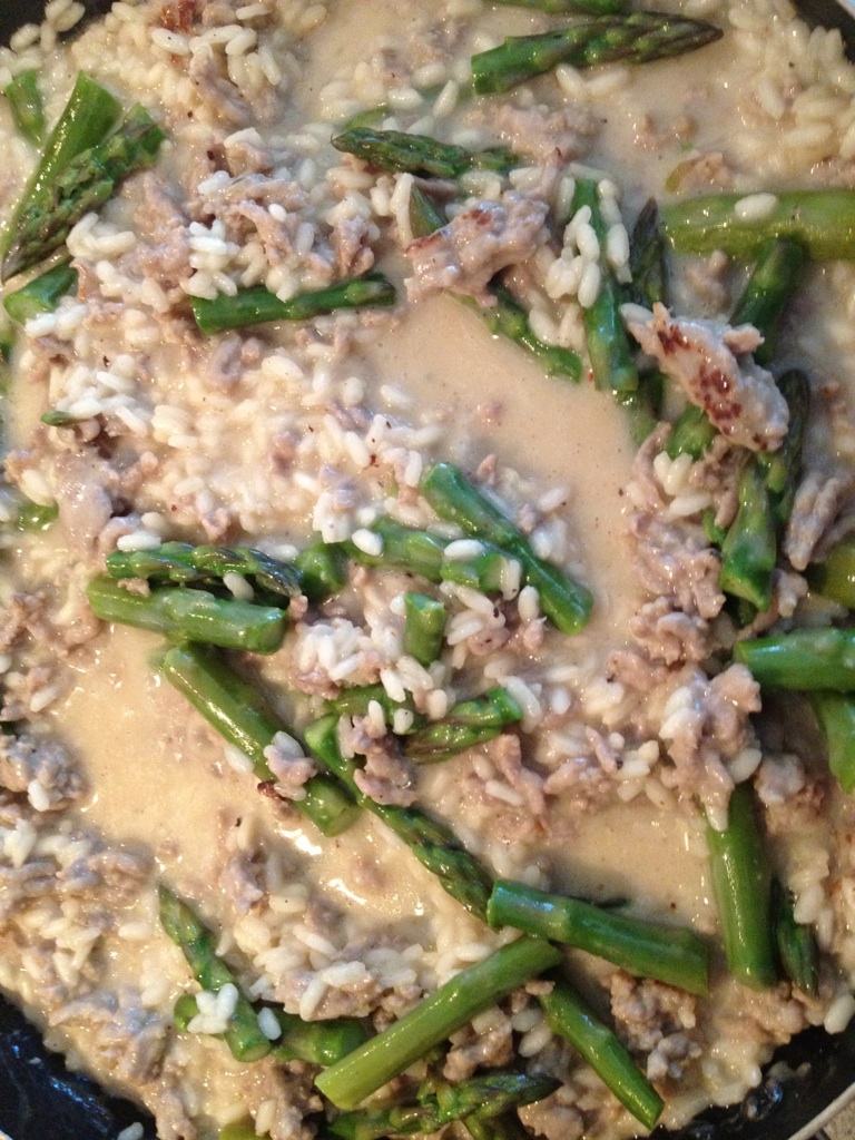 When the rice is almost done, return the sausage to the pan and add the asparagus. A few moments before serving, I gilded the lilly this time and added about 2 tablespoons of light cream that I happened to have on hand. Here’s a picture a few minutes before serving.