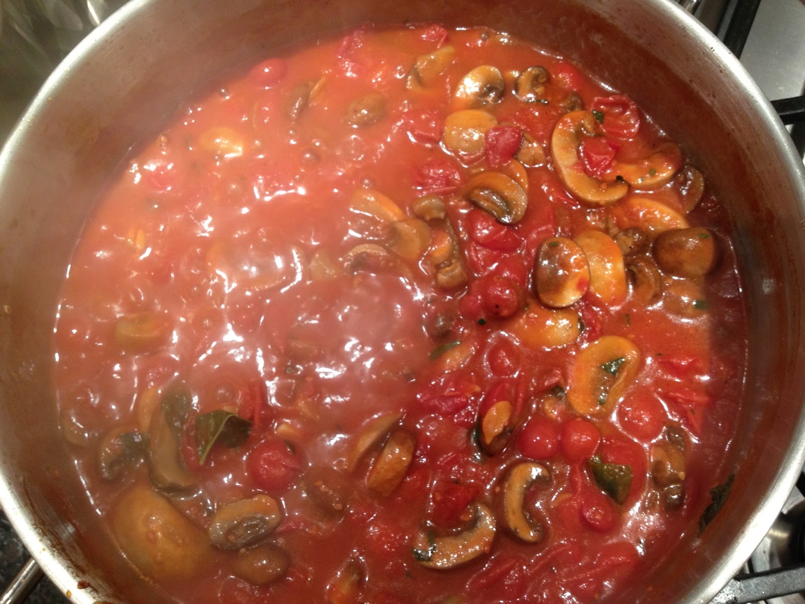 Saute the garlic in oil until fragrant and then add the tomatoes. They are whole, so gently break them with tongs or a wooden spoon. Add salt and pepper, let simmer over medium heat 15 minutes until they break down and soften. About 10 minutes in, add the basil and the mushrooms. When the sauce thickens, add the truffle butter and serve. We used this sauce with homemade Plin to great success. The truffle butter gives a nice sheen and consistency to the sauce and adds a “hidden” flavor to the recipe.