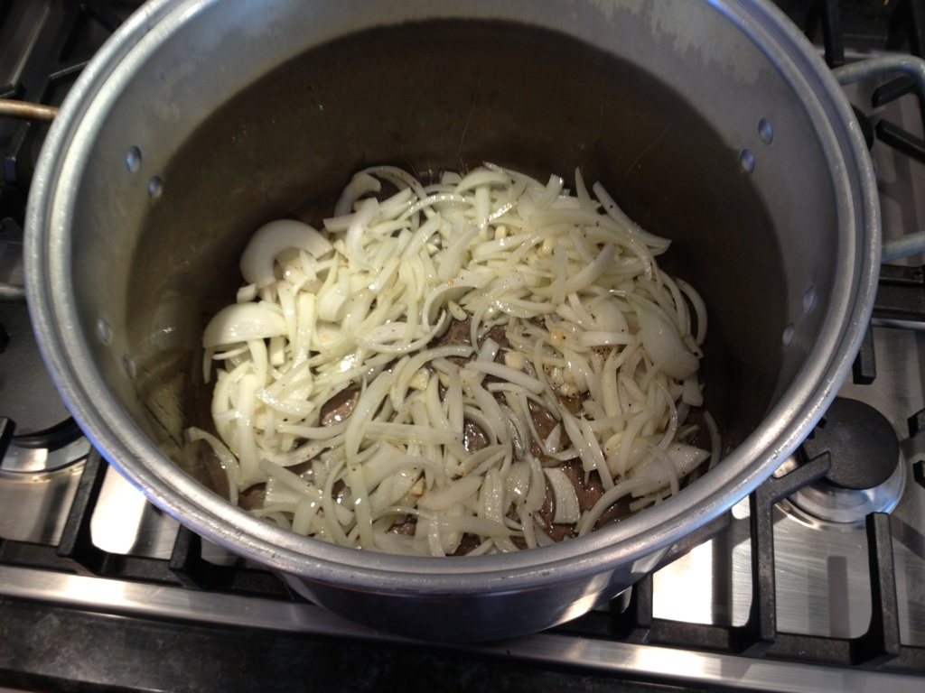 I tried to make mental note of every step in this process. It surely takes time, but it’s easy work. The first thing I did was assemble all the ingredients, chop the garlic and slice the onions. Mis en place: 4 cans Cento crushed tomatoes, 2 cans Cento San Marzano whole tomatoes, 10 cloves garlic sliced, 2 sweet onions sliced, 2 packages pork spare ribs, 2 veal shanks for Osso Bucco, 6 links sweet Italian sausage, and 2lbs ground beef for meatballs.
