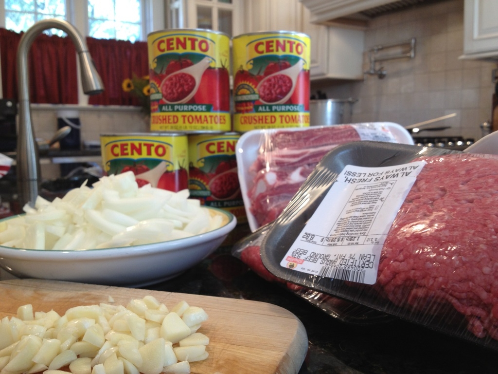 | Tomatoes, onions, garlic, and meat, all ready to go. |