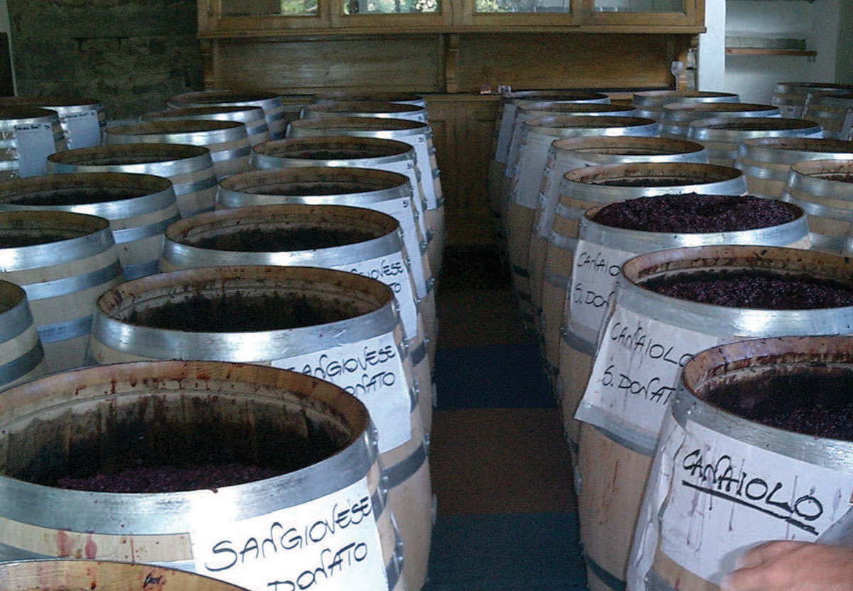 | ~ Wines fermenting in open topped barrique in the Testamatta Cantina. Graetz punches down the caps manually every day; 6 to 8 times during fermentation ~ |