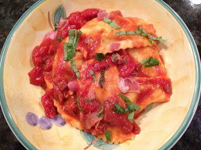 | Pansotti with prosciutto, cherry tomatoes and basil |