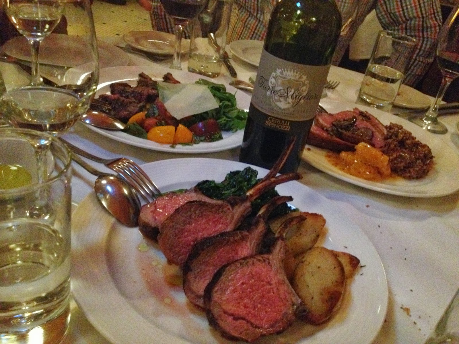 | Dinner – Clockwise from Bottom: Rack of Lamb with spinch and roasted potatoes, Wagyu Skirt Steak with Rocket and Reggiano, and Seared Duck Breast with Red Risotto. Stunning food by Paola’s NYC |